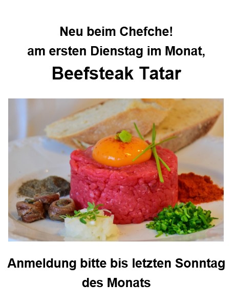 Ihre Wünsche stehen für uns stets im Mittelpunkt, dabei bedienen wir Sie mit Kompetenz, Spaß und Herzlichkeit. Zum Chef´che ist ein Ort , wo Sie Freunde treffen. Ihr Aufenthalt wird durch unsere natürliche, warme, positive und entspannte Atmosphäre zu einem immer wiederkehrenden Erlebnis. Sie sollen nicht nur zufrieden, sondern begeistert sein! Fühlen Sie sich einfach wohl!